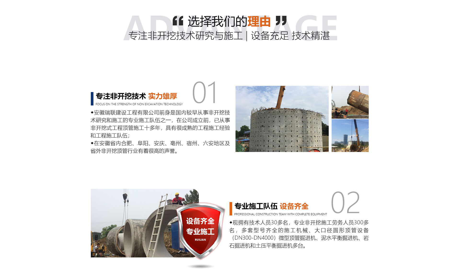安徽瑞聯(lián)建設(shè)工程有限公司前身是國內(nèi)較早從事非開挖技術(shù)研究和施工的施工隊伍之一,在公司成立前,已從事非開挖式工程頂管施工十多年,具有很成熟的工程施工經(jīng)驗和工程施工隊伍,在安徽省內(nèi)合肥、阜陽、安慶、亳州、宿州、六安地區(qū)及省外非開挖頂管行業(yè)有著很高的聲譽。面對日益擴(kuò)大的市場,公司于2014年正式成立,公司擁有勞務(wù)分包及市政公用工程總承包資質(zhì)。公司優(yōu)勢(文字):現(xiàn)擁有中高技術(shù)人員30多名,非開挖施工勞務(wù)人員300...